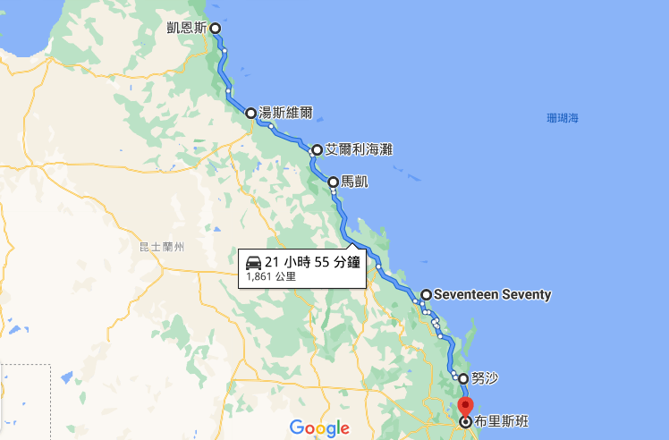 凱恩斯-湯思維爾Townsville(Magnetic Island)-艾爾利海灘 Airlie Beach-麥凱Mackay-1770-赫維灣 Hervey Bay(Fraser Island)-Rainbow Beach-努沙岬 Noosa Heads-布里斯班 Brisbane